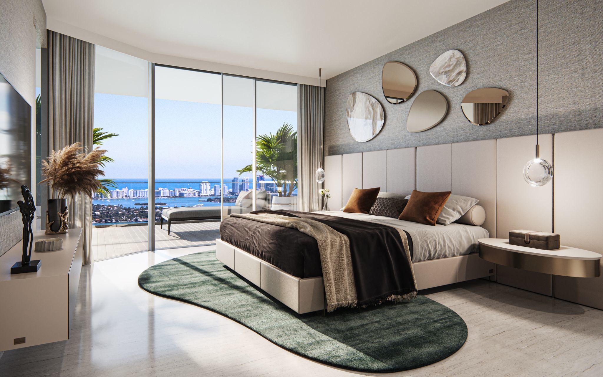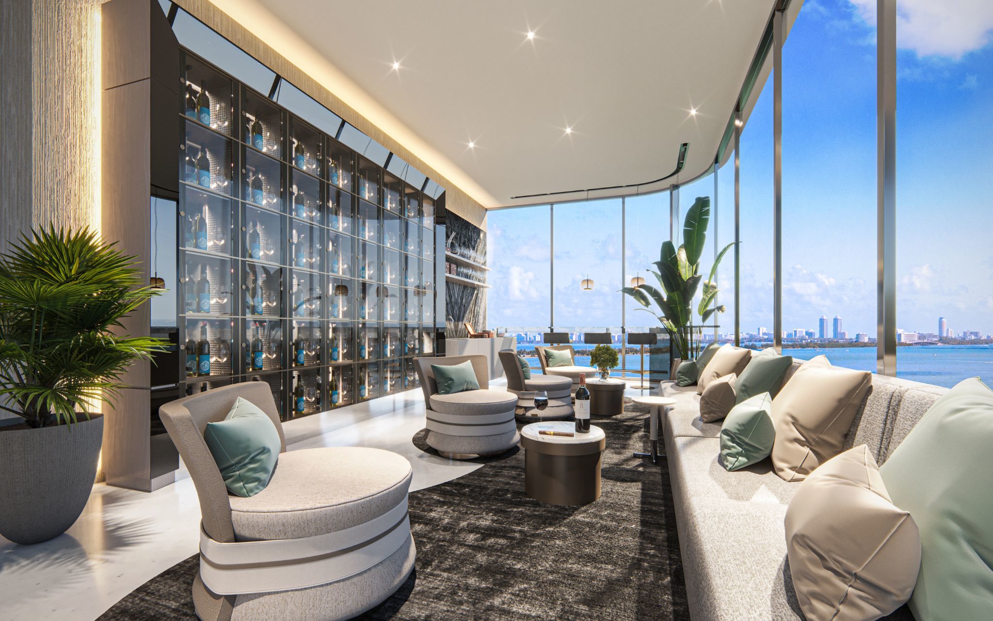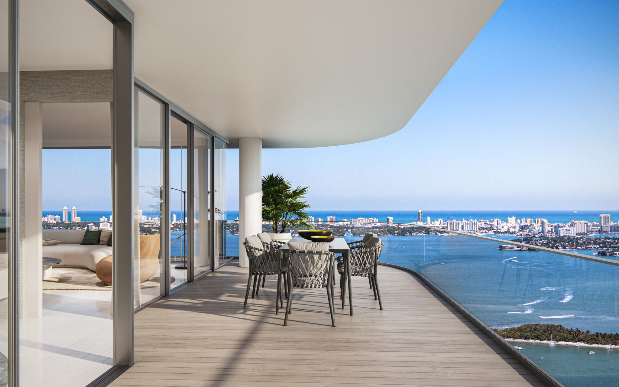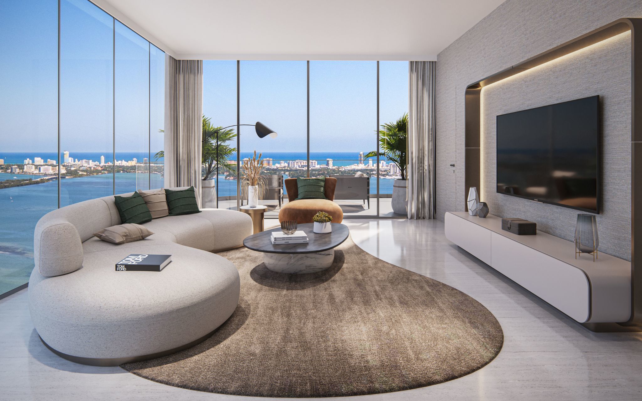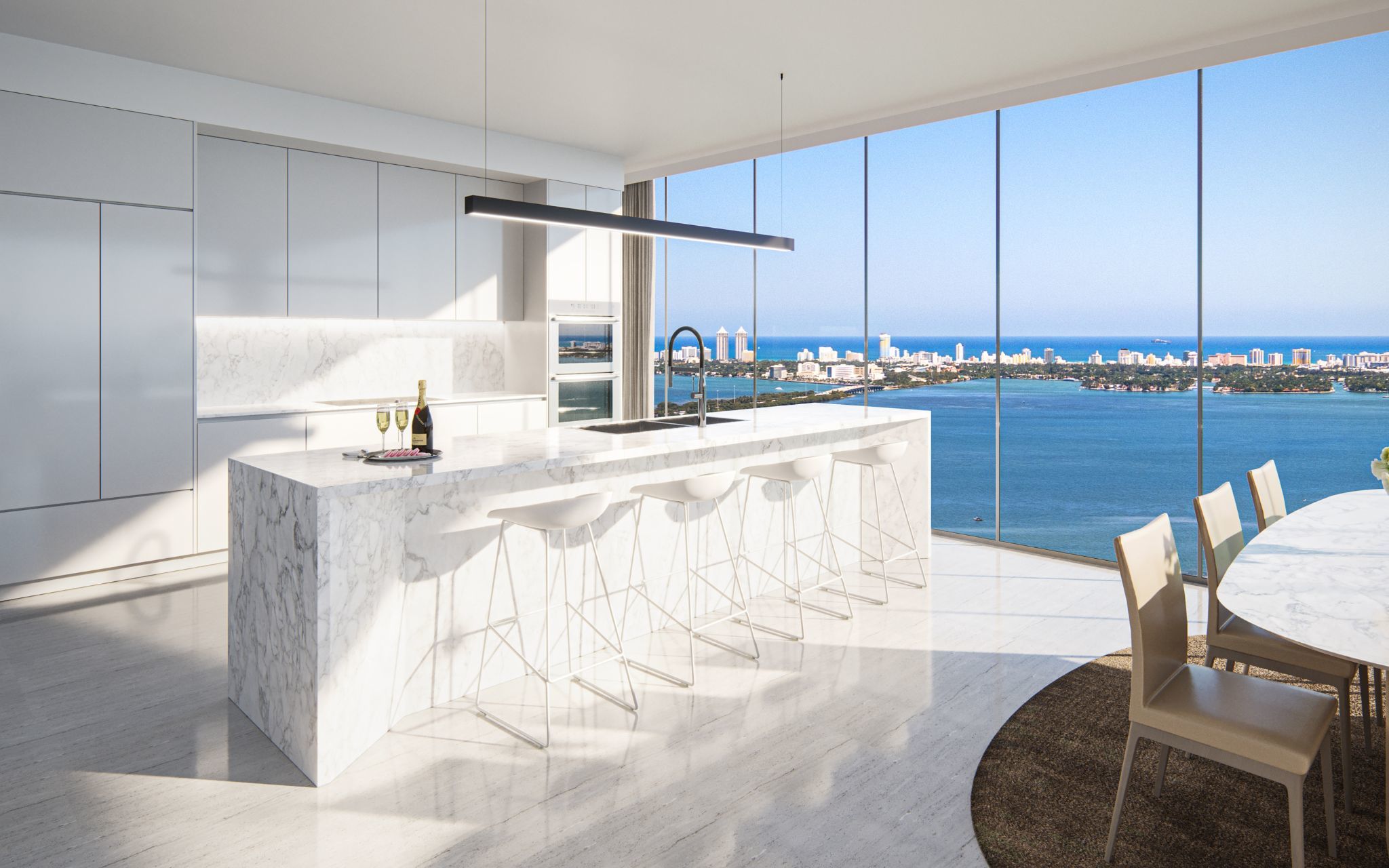 Each residence features floor to ceiling windows, treating residents to direct scenic views of Biscayne Bay and the Atlantic Ocean. The distinct flow-through design of each gives you east-facing waterfront views as well as west-facing city and sunset views from the bedrooms. Floors 3 through 50 are the Panoramic Residences, which have an open layout space with ten-foot ceilings while the Skyview Residences (Floors 51 through 56) also have an open layout space with slightly higher, eleven-foot ceilings. All units feature an area ideal for either an office, den, studio or media room.