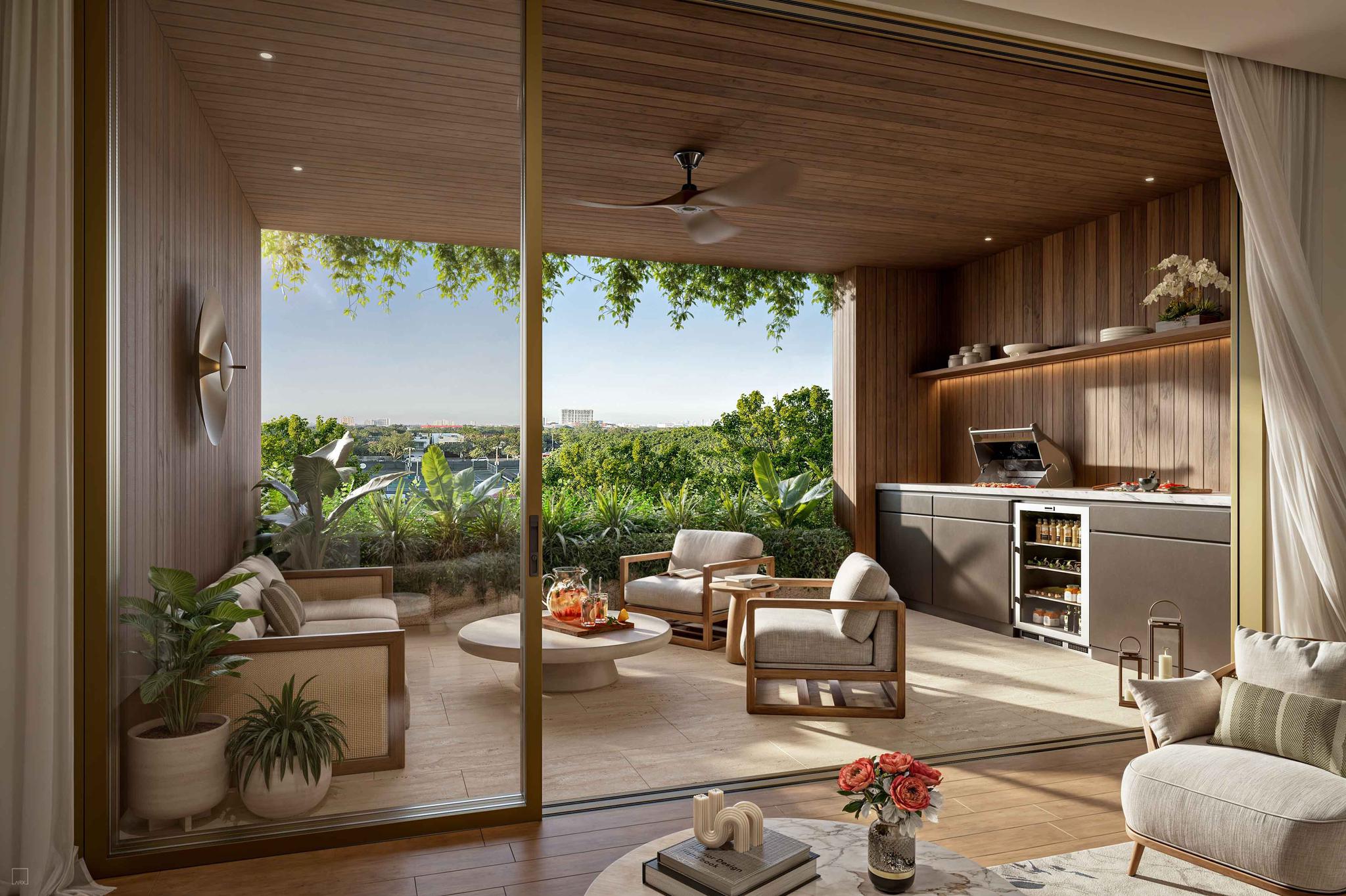 - Summer kitchens on 12-foot-deep terraces—ideal for entertaining under the Grove’s canopy